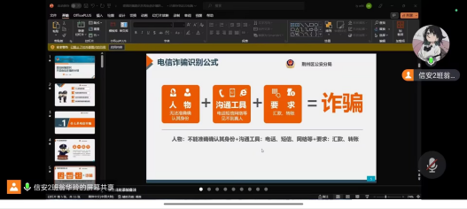此次班会重点向学生开展了防诈骗安全常识宣传、防诈骗案例讲解和防诈骗防范能力教育;同时各班采取形式多样的方法向学生讲解常见的诈骗手段以及在生活中需要掌握的防诈骗口诀,并在各班级内开展了主题为“发生在我身边的诈骗”的大讨论。