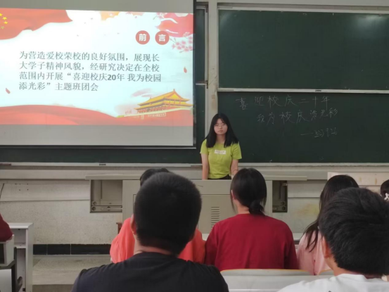 在十月以团支部为单位召开了以此为主题的班会活动,本月示范团支部为计科32308班,团会主题为“喜迎校庆二十年,我为校园添光彩”,主讲人为朱娇娇同学,计科32308班全体同学参加。