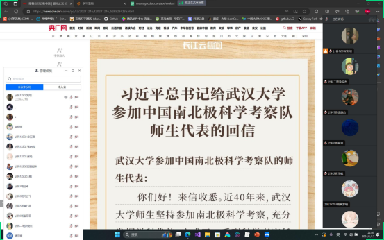 理论学习。各班班长作为领学人通过学习强国、人民日报等客户端搜集相关视频和新闻报道带领班级同学共同学习习近平总书记给武汉大学参加中国南北极科学考察队师生代表重要回信精神相关内容,深刻领会习近平总书记对广大师生要始终胸怀“国之大者”,接续砥砺奋斗,练就过硬本领的深刻内涵。