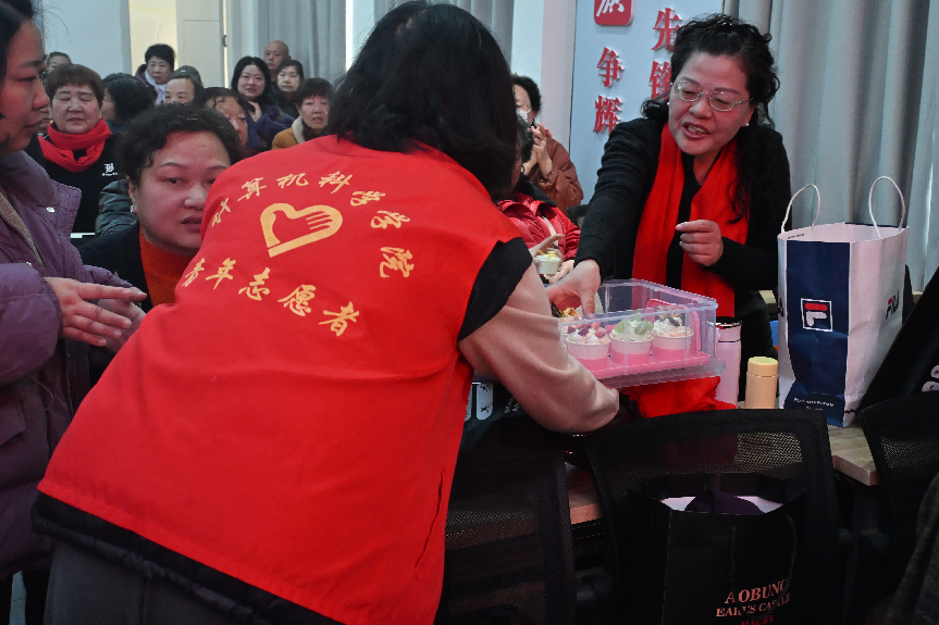 热闹的表演之外,现场更流动着脉脉温情。穿梭在人群中的“红马甲”成为联欢会上一道亮丽的风景线。在互动环节,志愿者们协助社区工作人员,将象征着甜蜜与祝福的节日蛋糕以及精心准备的小礼品,逐一送到居民手中。这份甜意不仅停留在舌尖,更传递着沉甸甸的关怀与新年的美好祝愿。
