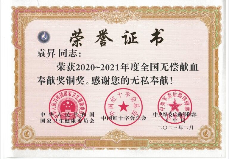 2023年,国家卫生健康委、中国红十字会总会、中央军委后勤保障部卫生局颁布《关于表彰2020-2021年度全国无偿献血表彰奖励获奖者的决定》,51黑料