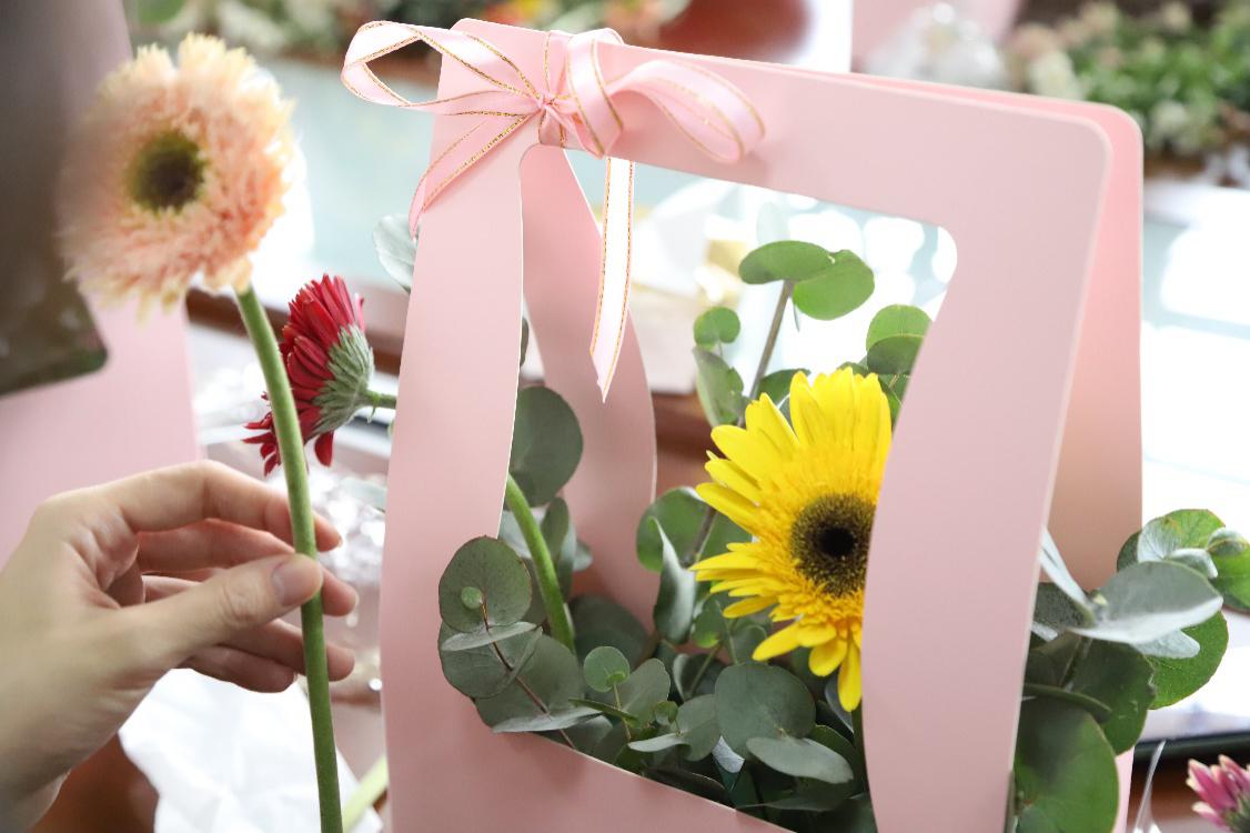 经过一个小时的教学,一支支简单、漂亮的鲜花错落有致地插在了花盒中,一束束独具匠心的花艺作品生机盎然、美丽摇曳,万紫千红中赏花色、嗅花香,大家更是笑靥如花,幸福如花。