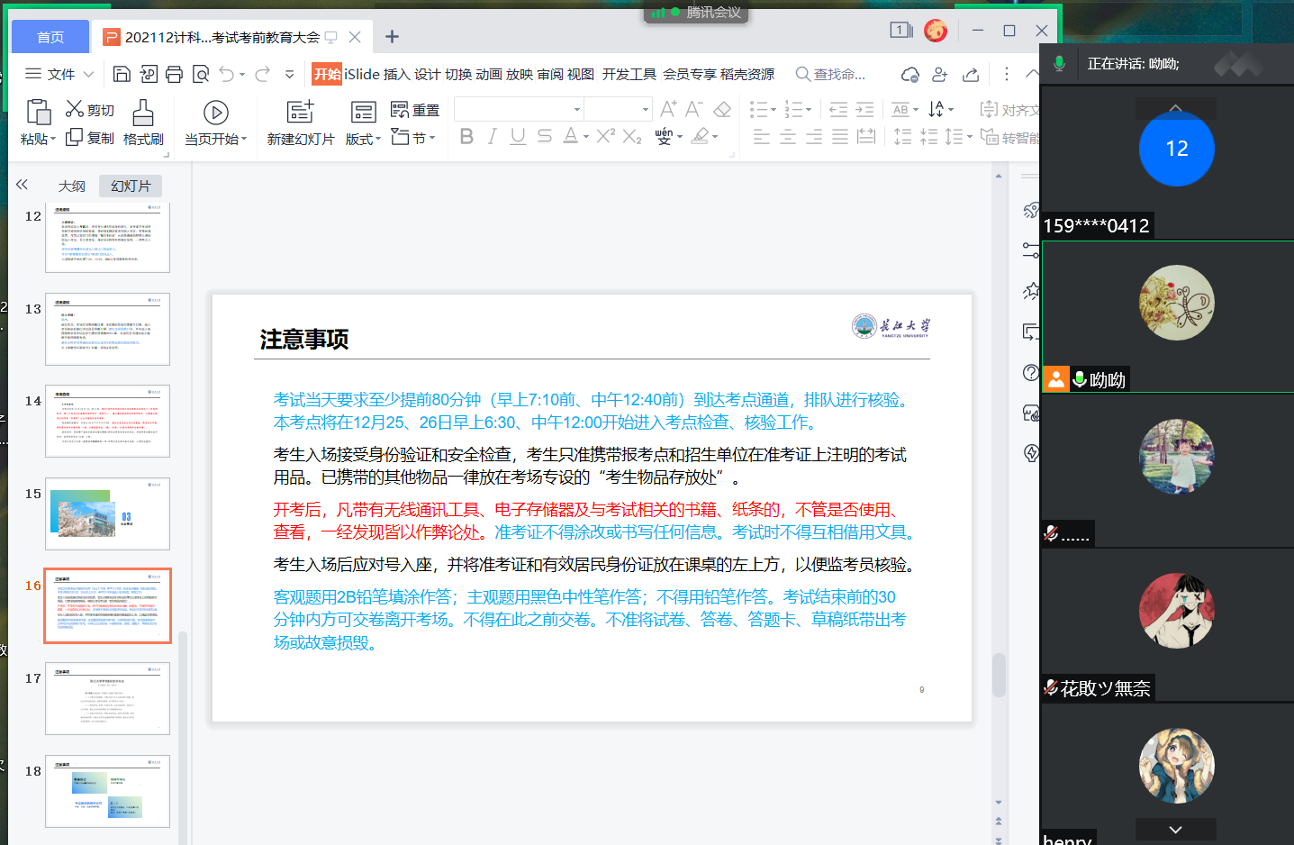 会上,周老师首先表达了对即将参加研究生考试的同学们的祝福,并从疫情防控要点出发,详细讲解了相关材料的准备,以及进入“考点-考区-考场”的注意事项。随后,周老师提醒大家一定要遵守考风考纪,不要有作弊的想法和嫌疑,遵守考场要求,听从监考老师的指示。最后,周老师希望大家相信自己,勇敢面对考试,沉着冷静应试,并照顾好自己的衣食住行,让自己保持好的状态去迎接研究生考试。
