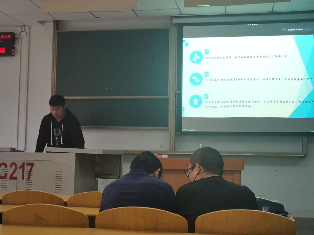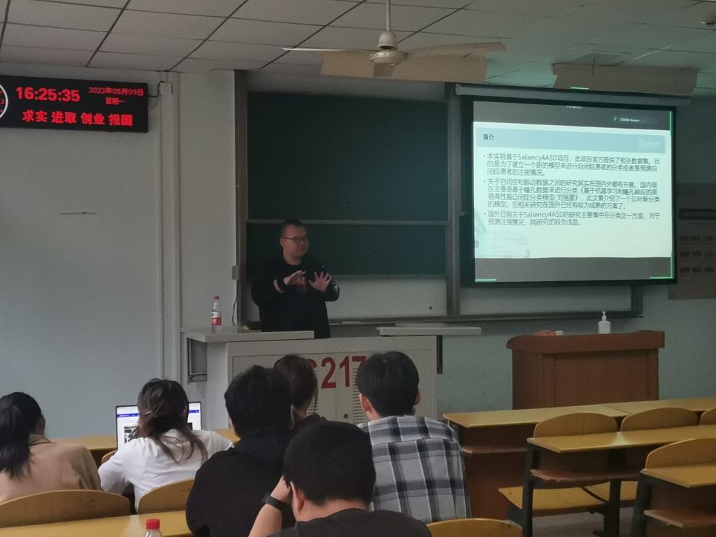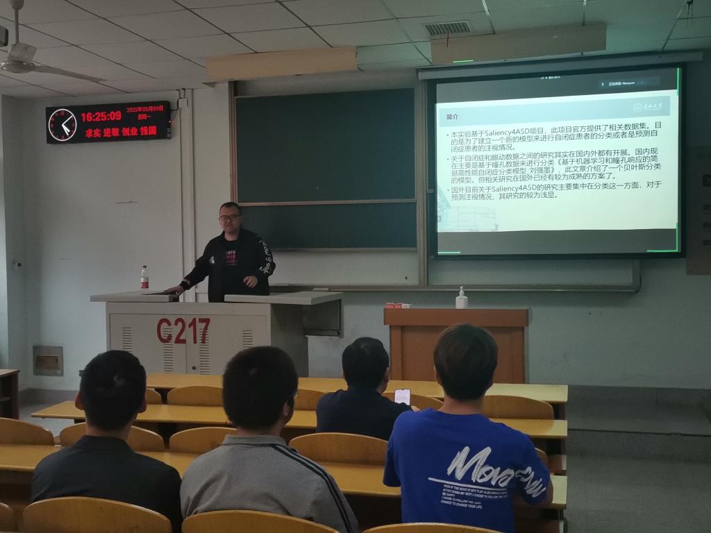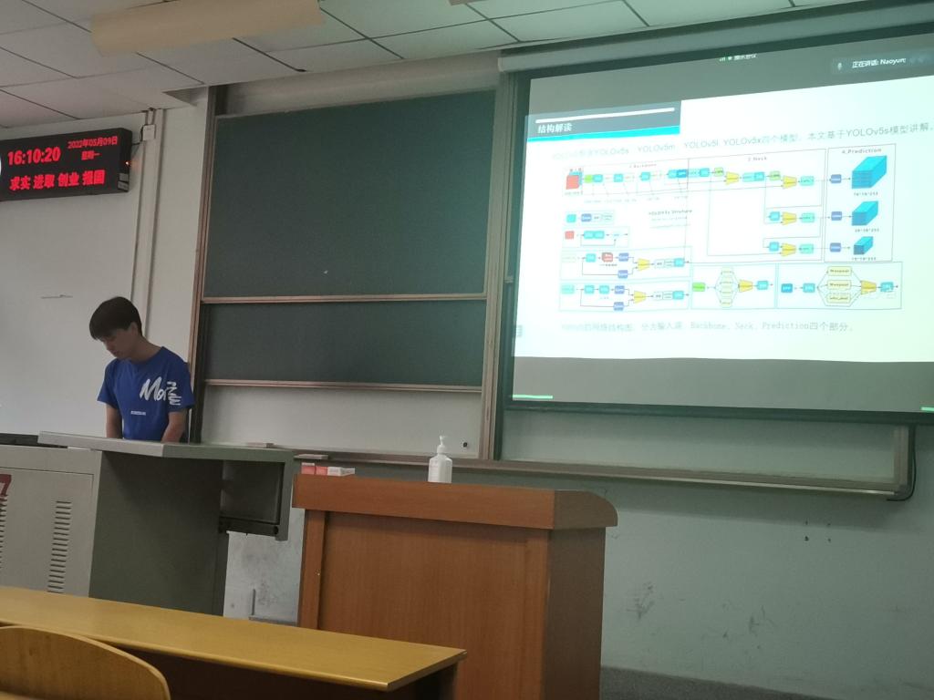 10位研究生依次登台演讲,分别围绕各自的研究方向,为同学们分享了10个课题:基于YOLOv5算法的血液细胞检测、人工智能在网络安全领域的应用、AI能否取代程序员、分布式集群的弹性资源分析与优化、基于眼动数据和图像特征的自闭症早期筛查系统、GraphQL在智能家居中的应用与改进、YOLO模型推导、Dynamic Routing Between Capsules、砂岩岩心CT图像空隙分割、股票K线相似性分析与应用等内容。学术论文报告会已经成为同学们知识共享和传播的一种重要方式,在演讲过程中,指导老师和学生们与演讲人针对相关研究成果互动、探究。每名研究生演讲完后,四位导师从多角度对演讲人的汇报进行仔细点评,对其研究内容可能遇到的科研困难进行指导,通过点评有效促进了研究生的成长。