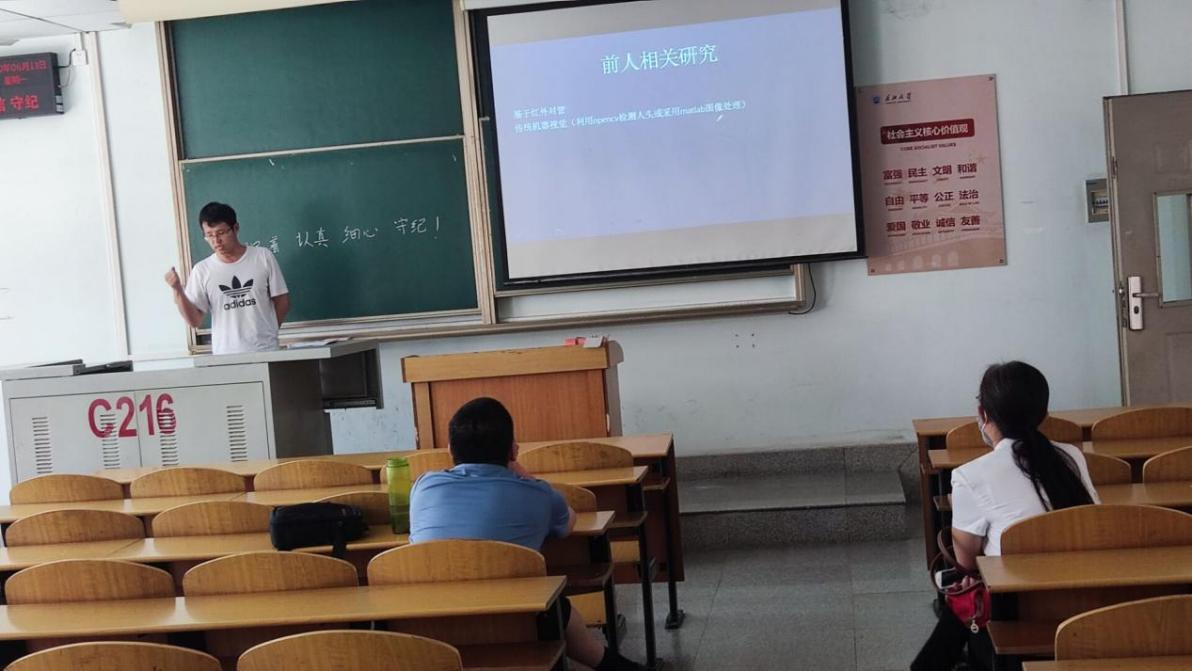 9位研究生依次登台演讲,分别围绕各自的研究方向,为同学们分享了9个课题:葡萄糖霜霉病检测分级、基于深度学习的深度估计算法研究、改进YOLOV5的口罩检测算法、基于改进YOLOV5的安全帽佩戴检测算法、牛奶智能装载算法项目设计实现、基于深度学习的教室智慧节能控制系统设计、基于时间序列的水位预测、测井曲线分层方法研究、基于顺序置乱和三角扩散的彩色图像加密算法等内容。学术论文报告会已经成为同学们知识共享和传播的一种重要方式,在演讲过程中,导师与听众和演讲人针对相关研究成果互动、探讨。每名研究生演讲完后,两位导师从全方位对演讲学生的汇报进行仔细点评,对其研究内容可能遇到的科研困难进行指导,通过点评有效促进了研究生的成长。