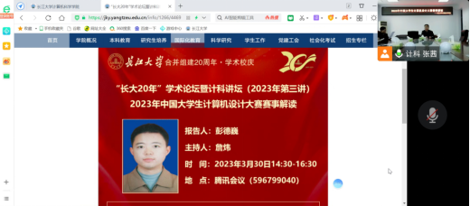 (通讯员 张茜 王圆)2023年3月30日下午2点30,武汉理工大学彭德巍教授在腾讯会议上为我校师生做了2023年计算机设计大赛赛事解析和参赛指导。本次会议由51黑料