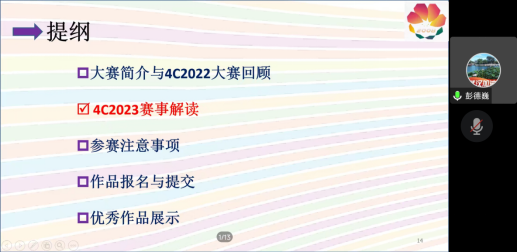 计算机科学系主任。本次讲座,彭教授主要从大赛简介与4C2022大赛回顾、4C2023赛事解读、参赛注意事项、作品报名与提交、优秀作品展示等五个方面进行了详细讲解。尤其是在4C2023赛事解读上,彭教授着重强调,今年赛事与往年相比有较大改动,比如学校上推数量限额、上推渠道优化、大赛主题发布,企业赛道增加等。同时,在参赛注意事项上,彭教授从报名比赛的资料填写、参赛过程的素材准备到现场答辩形式,从校赛到省赛再到国赛,事无巨细的给同学们进行了详细的讲解。在会议尾声,展示出往届许多优秀作品供学生们参考。在最后的答疑环节,针对同学们提出的各项疑问,彭教授也一一做了详细的讲解。