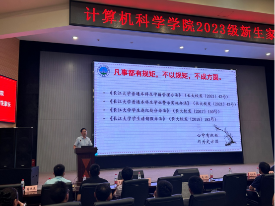 党委副书记肖彬详细解读了学校学籍管理办法、学业警示实施办法、违纪处分办法以及请销假制度,介绍了学校本科生奖励与资助体系。希望家长能够引导学生自觉遵守学校、学院相关管理制度,关注学生心理健康,配合学院共同助力学生成长成才。