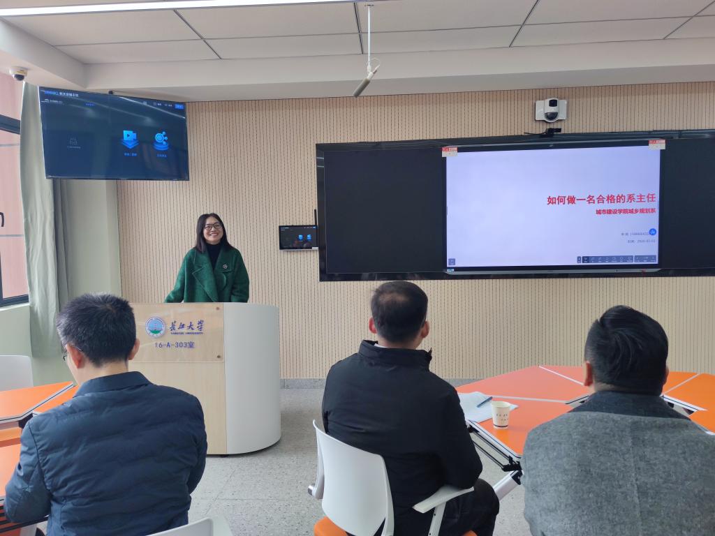 城市建设学院城乡规划系主任丰燕结合教学管理经验,交流了系主任的存在价值和工作职责,从提高水平、提高认识、提高境界、提高修养四个方面提出了建设性意见和建议。