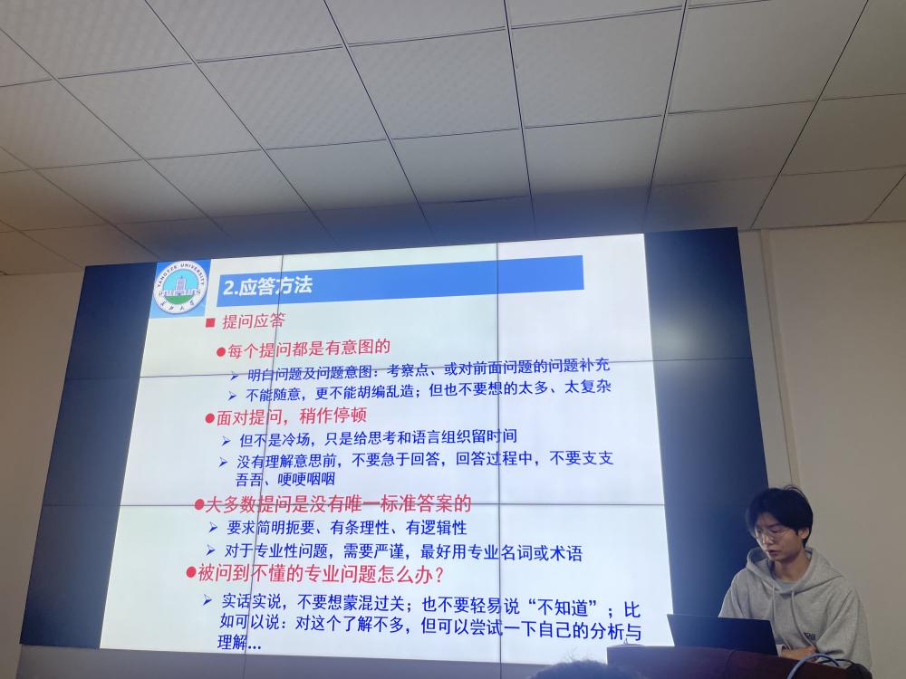 学院2023级研究生徐东来同学,从充分准备、应答方法、常见提问和注意事项四个方面出发,和大家交流了研究生复试前后必须注意的相关细节,帮助同学们更加了解考研复试流程以及内容,增强顺利通过考研复试的信心和决心。同学们纷纷表示收获颇多,对自己接下来的学习具有指导意义。