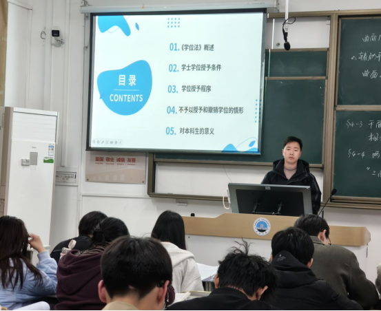 3月7日至13日,学院组织各班以主题班会的形式开展《学位法》专题学习活动。各班辅导员结合具体案例,深入浅出地讲解了《学位法》中关于学位授予条件、程序、撤销等核心内容,引导学生思考《学位法》对自身学业和未来发展的影响。