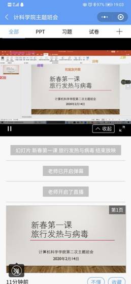 采用雨课堂平台召开了本学期第二次全体学生网络班会,共同观看学习张文宏教授的微课堂:新春第一课《旅行发热与病毒》。学院党委副书记颜学俊、全体辅导员、部分班主任及2000余名本科生、研究生通过网络参加了本次学习。