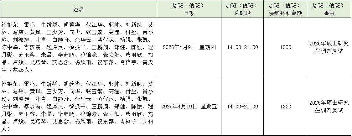 2026年4月研究生招生等工作加班(值班)误餐情况公示