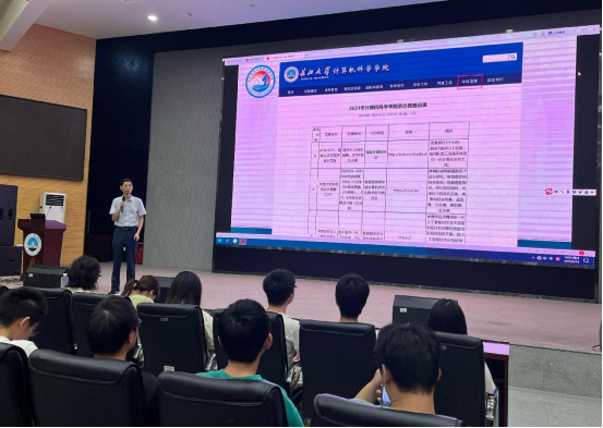 学院主管教学副院长陈中举老师以“赛砺青春 创赢未来”为题,为2024级本科生解读了学院“一生一赛”的培养要求。他首先介绍了人才培养方案中对竞赛的要求,强调竞赛是提升创新能力、团队协作能力的重要途径。随后,陈院长列举了学院承办的赛事清单和查询途径,并说明学院为参赛学生提供专项经费、指导教师、实验室资源等全方位支持。